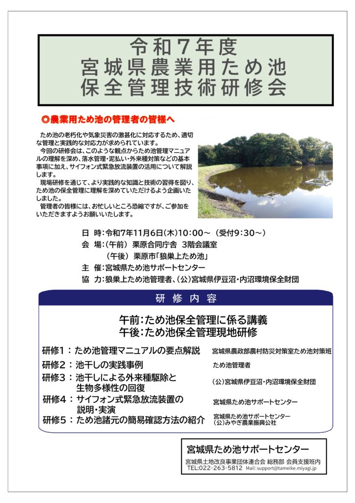 「令和7年度 宮城県農業用ため池保全管理技術研修会」を開催いたします