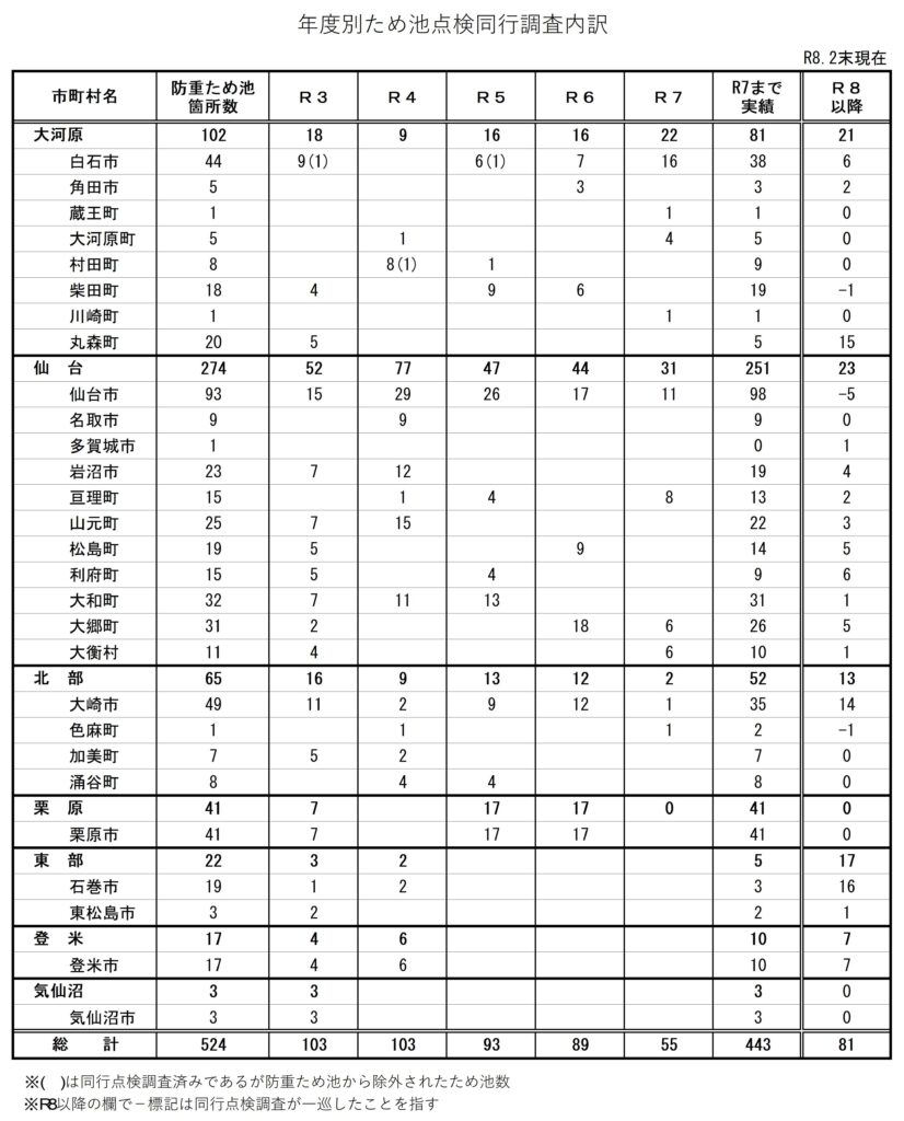 令和3年度から令和7年度までに同行調査した年度別・市町村別のため池数の内訳は下表のとおりです。
